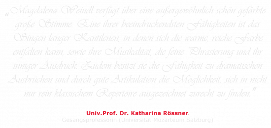 Magdalena Weindl ist eine junge, ambitionierte Sopranistin, deren warm-strahlende Stimme das Publikum verzaubert. Mit großem emotionalem Ausdruck und einer Fülle an Klangfarben zieht sie ihre Zuhörer in den Bann und bewegt sich dabei durch verschiedenste Genres: Ob Oper oder Lied, Romantik, Klassik, Neue Musik oder Swing. Magdalena Weindl weiß sich einnehmend zu präsentieren.